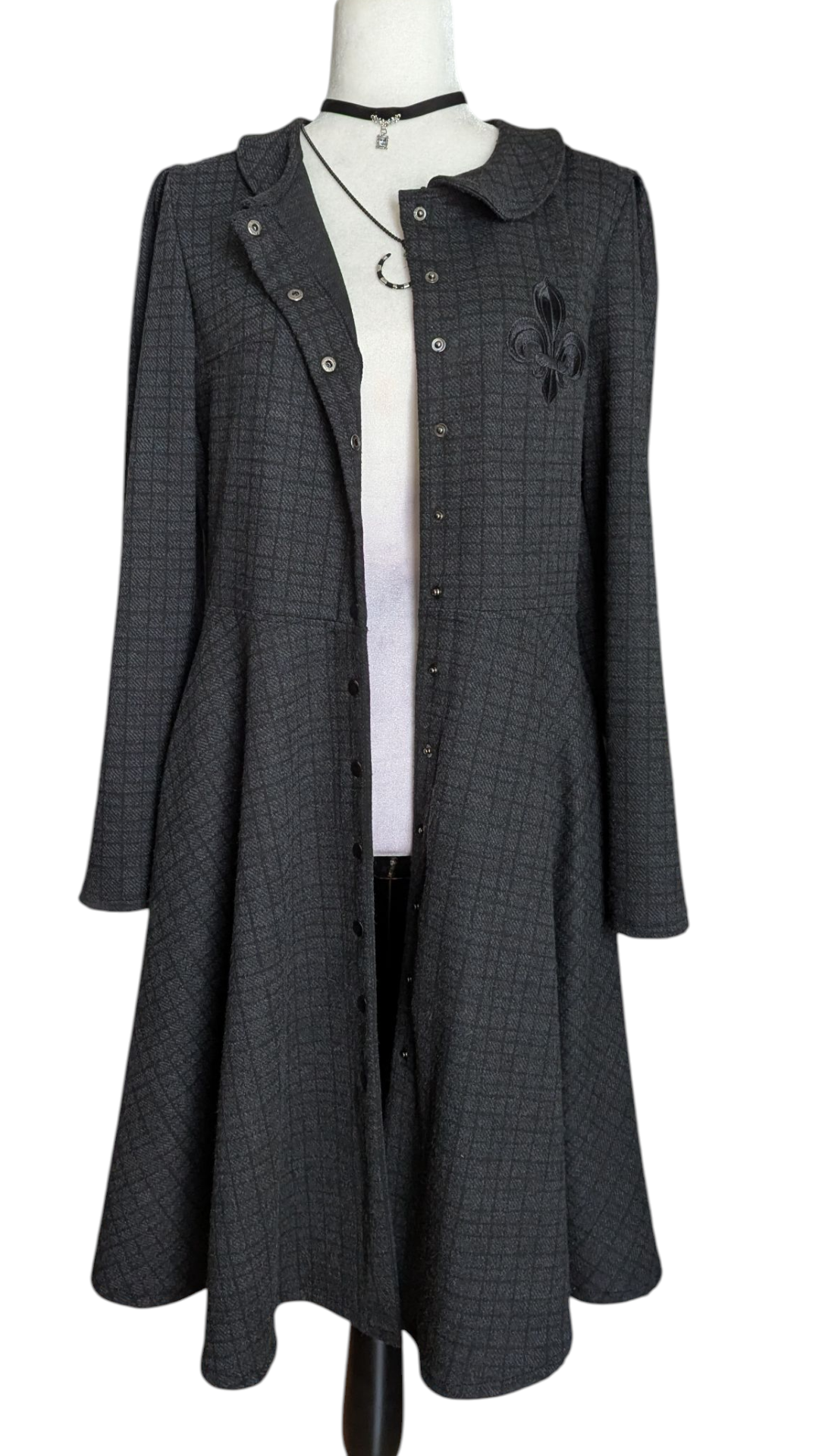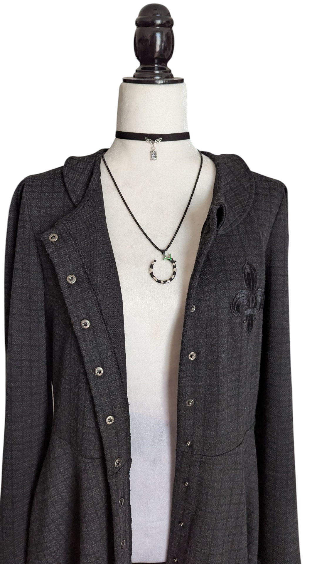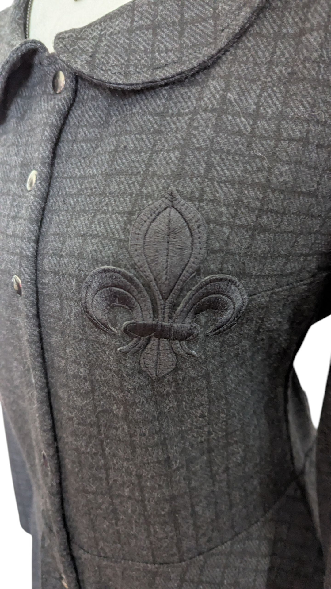 Abrigo tacto paño de tejido de punto colores gris oscuro y negro. Con cuello bebé, bolsillos laterales escondidos, cierre frontal con snaps metálicos, flor de Lis bordada y cosida, acordonado trasero ajustable con lazo negro de doble raso y pasamanería negros.