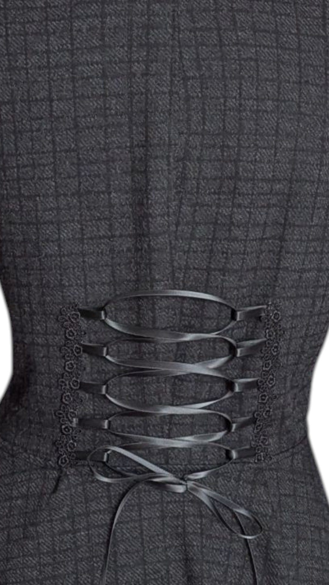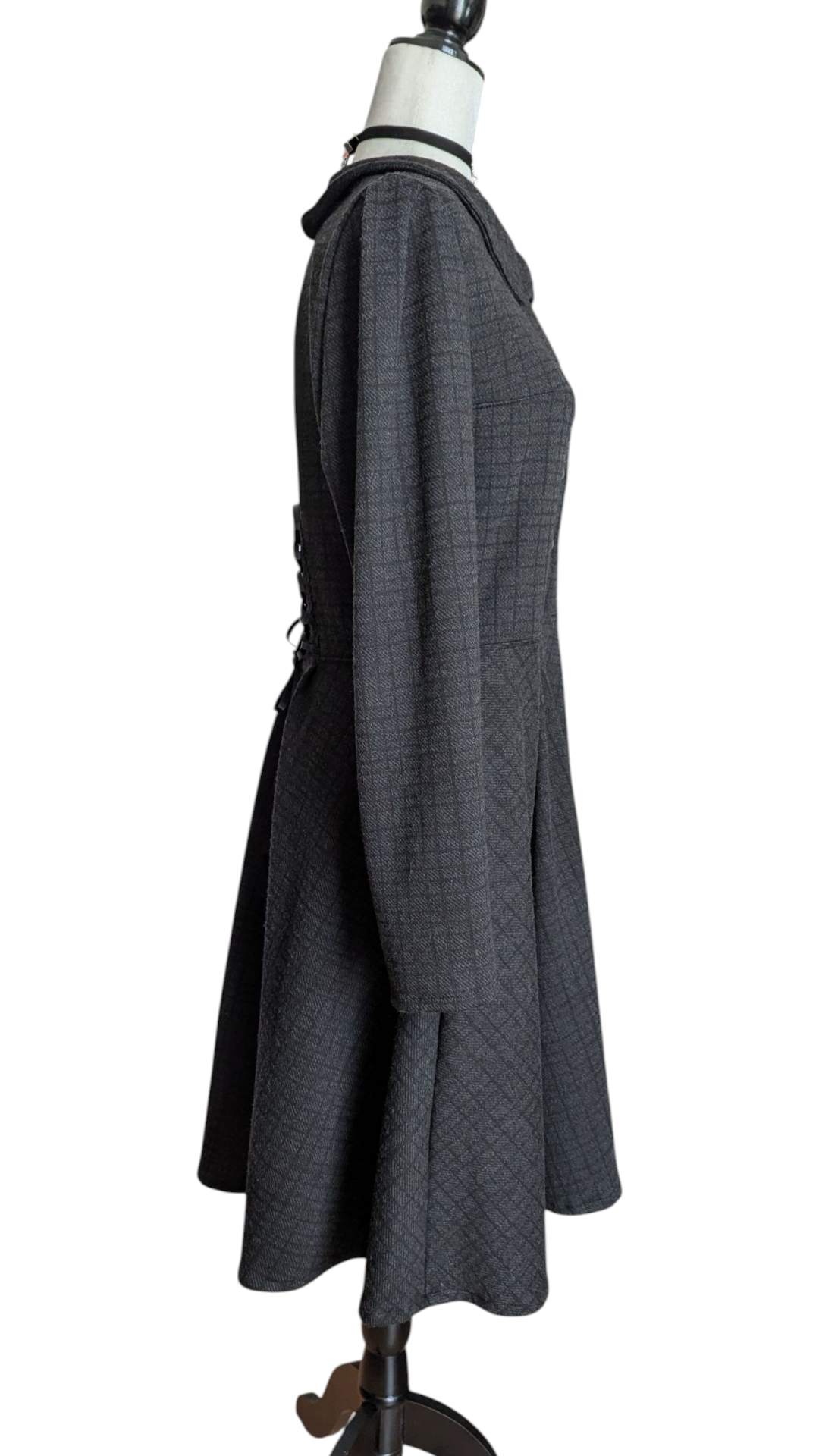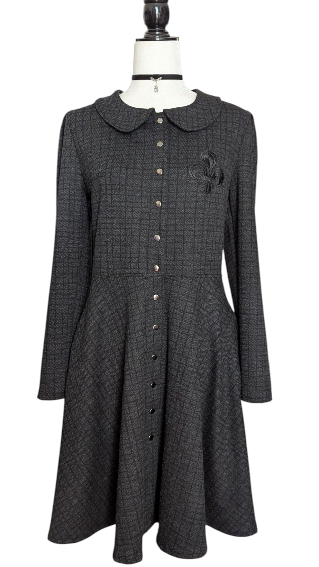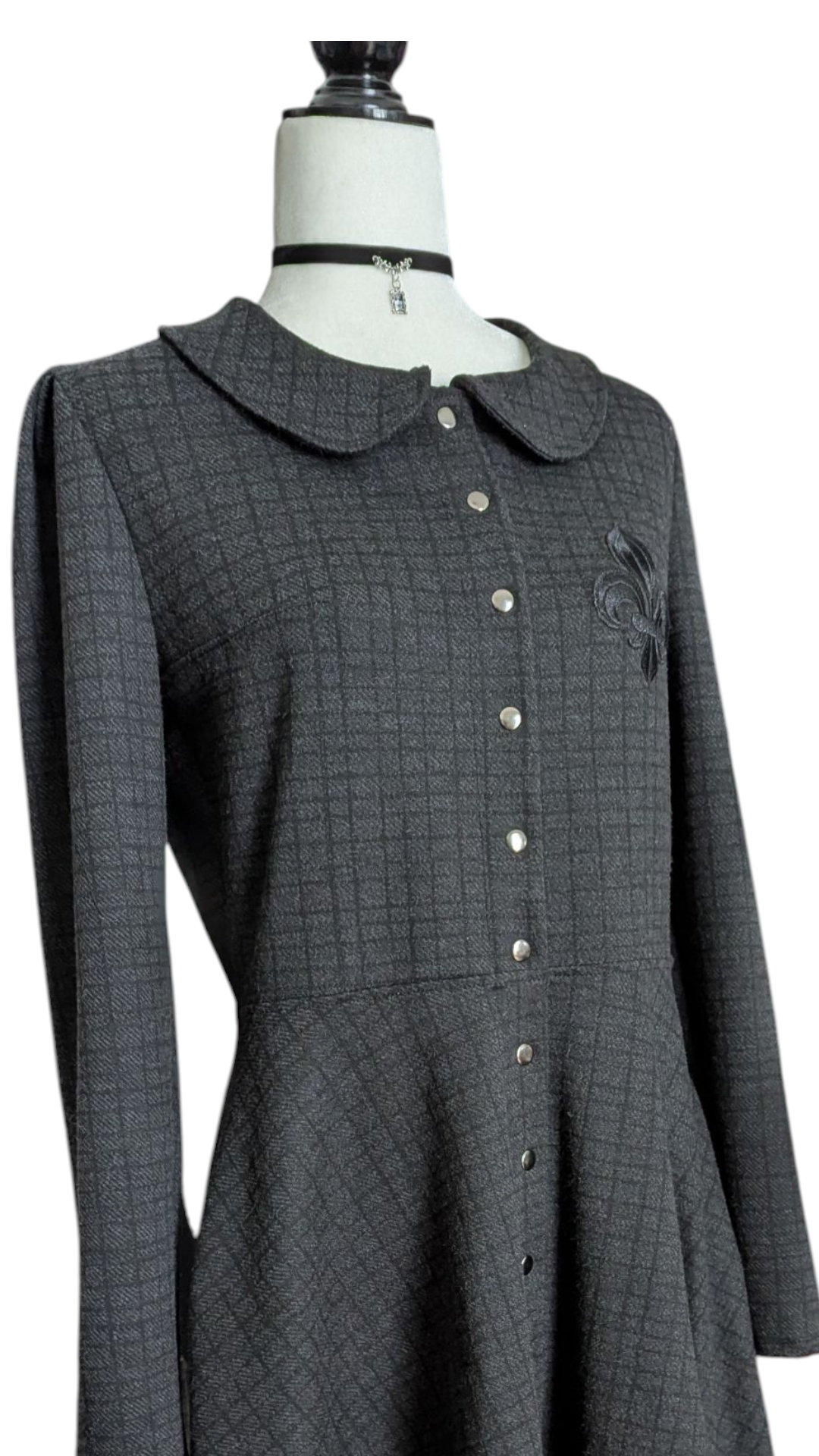 Abrigo tacto paño de tejido de punto colores gris oscuro y negro. Con cuello bebé, bolsillos laterales escondidos, cierre frontal con snaps metálicos, flor de Lis bordada y cosida, acordonado trasero ajustable con lazo negro de doble raso y pasamanería negros.