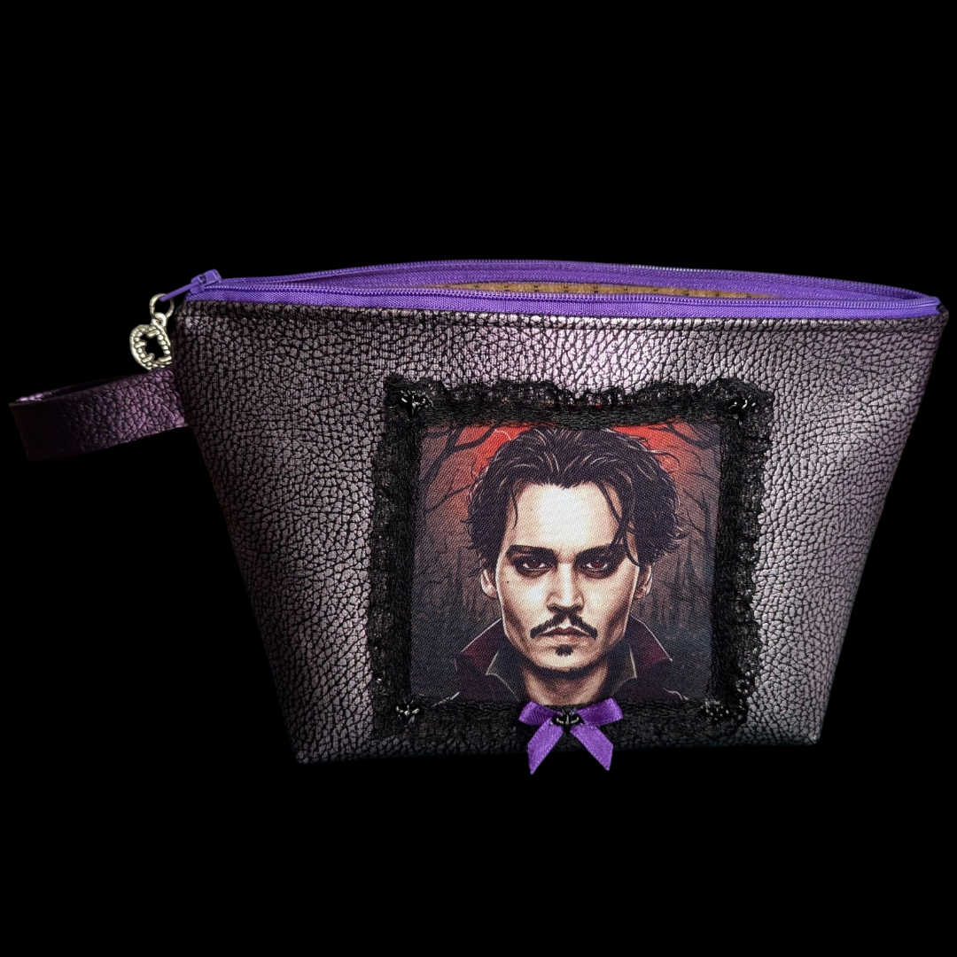 Neceser de piel sintética morada metalizada con forro, cremallera morada, pasador con dije de boca de vampiro y parche de Johnny con puntilla negra y mini dijes negros de murciélagos. Medidas 14cm de alto x de ancho mayor x de ancho menor x 10cm de profundidad.